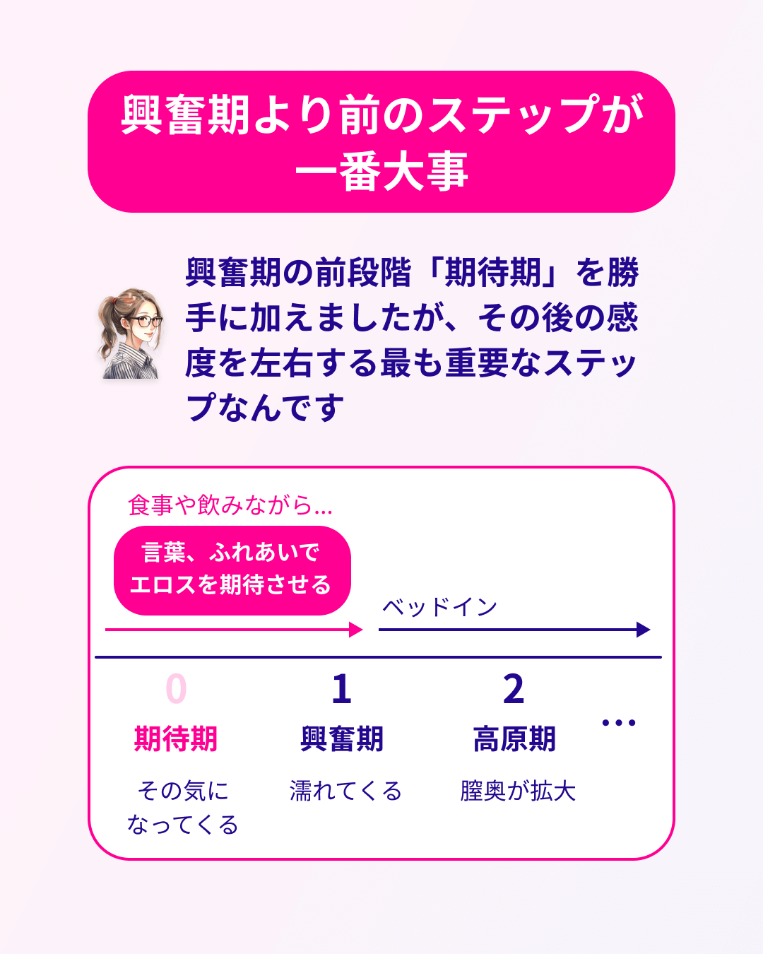 私は興奮期の前に「期待期」という段階があるのではないかと考えています。この段階がその後の感度を左右する重要なステップ!