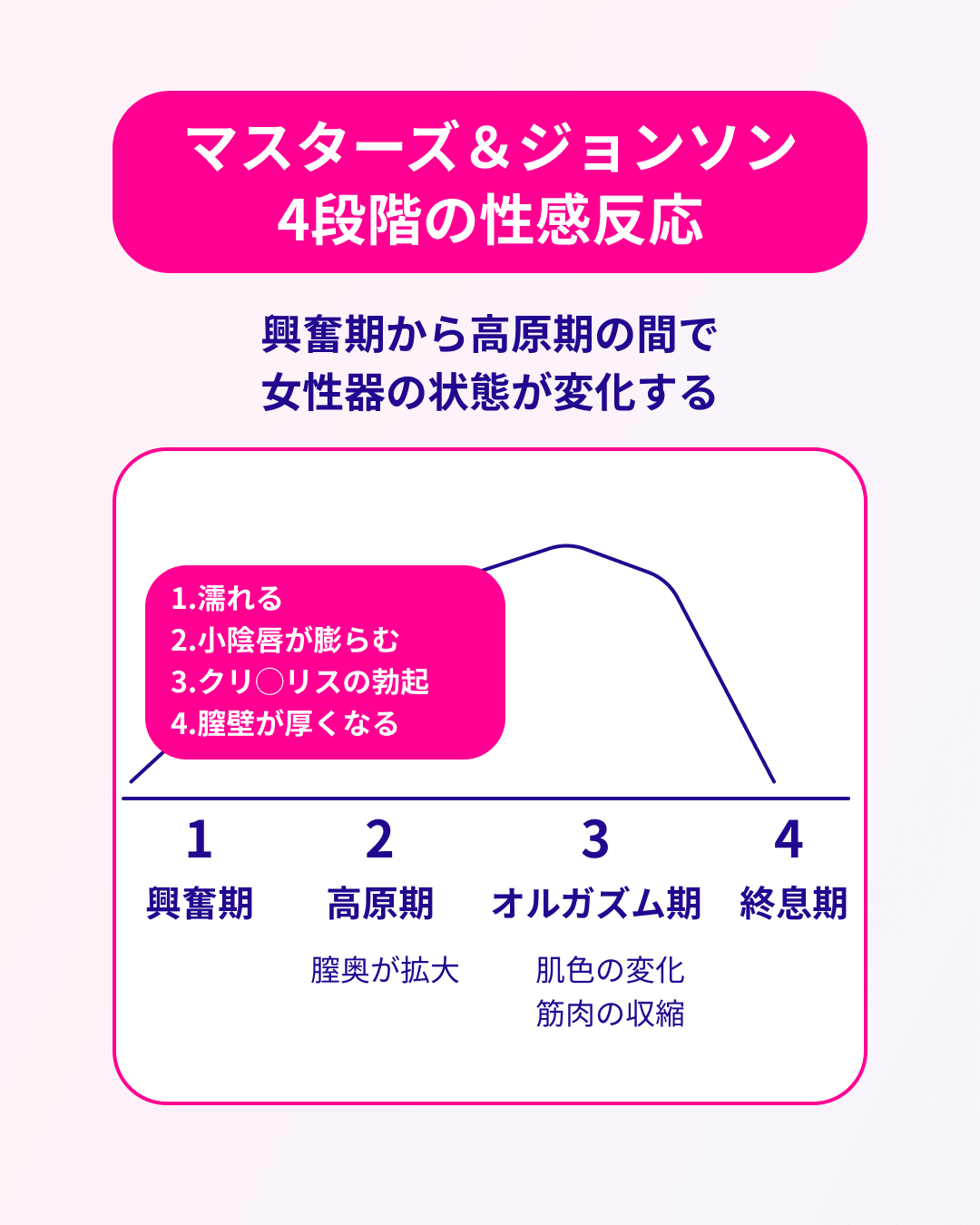 マスターズ&ジョンソンによると、性の反応の段階には下記図のように4段階あると言われています。それぞれの段階で女性器の状態が変化していきます。