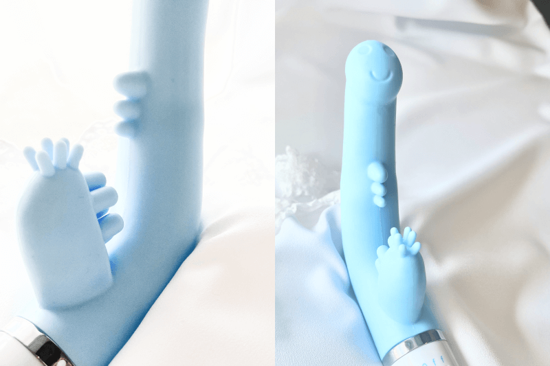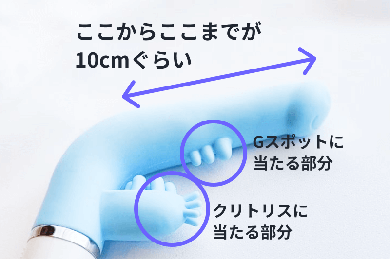 女性の膣の長さは8〜10cmなので、途中までしか挿入できない人もいると思いますが、Gスポット突起部分が膣に入ったぐらいで少し角度を加えるとクリトリス突起が当たります。突起部分は柔らかくてブルブルと細かい振動が体感できます。