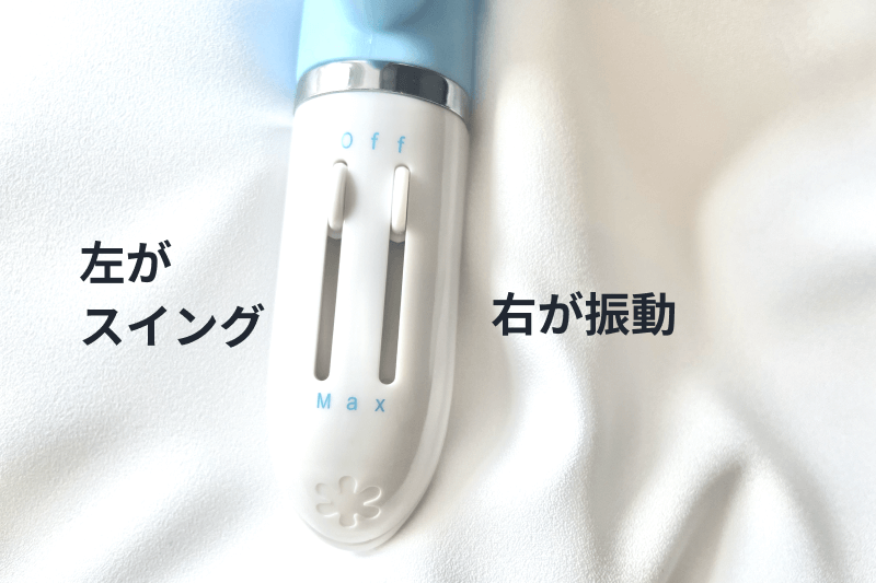 ほかのバイブレーターは、ボタンを押すごとに段階が変更されるものが多いのだけど、それだと何回押したらどんな動きだったっけ?というのを理解するのに頭を悩ますので、このスライドだと迷わず使えるのでありがたい。スウィングはMAXにしても小ぶりです。
